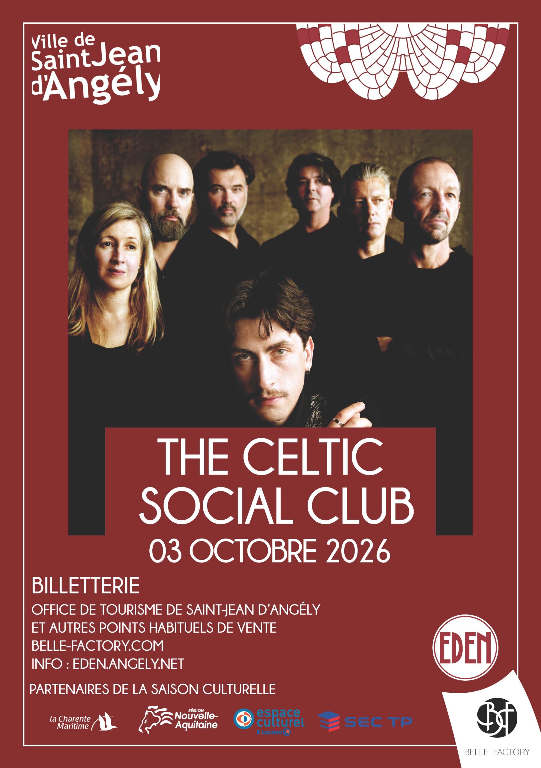 Après avoir conquis la scène des Vieilles Charrues en 2023, le groupe pose ses valises le temps d’une soirée à Saint-Jean-d’Angély. Connu pour sa musique pop celtique, rock et indie-folk, le groupe vous transporte sur scène avec une énergie brute et puissante ! Porté par 7 Franco-Irlandais, The Celtic Social Club signe leur 5ᵉ album studio et une tournée : “You Should Know Tour 2026” qui passera par Saint-Jean-d’Angély ! Leur dernier album révèle des sons bruts, précis et profondément maîtrisés.